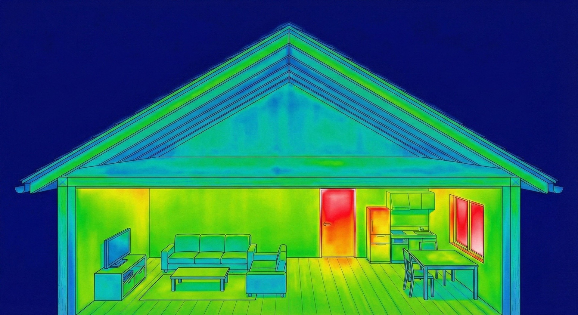 This thermal image shows what happens after your attic is properly insulated. The roof stays cooler, which means less heat is escaping through the attic and out of your home. Inside, temperatures stay more consistent, so your HVAC doesn’t have to fight constant heat loss and heat gain. The remaining “hot spots” are usually around windows and doors, not the attic.